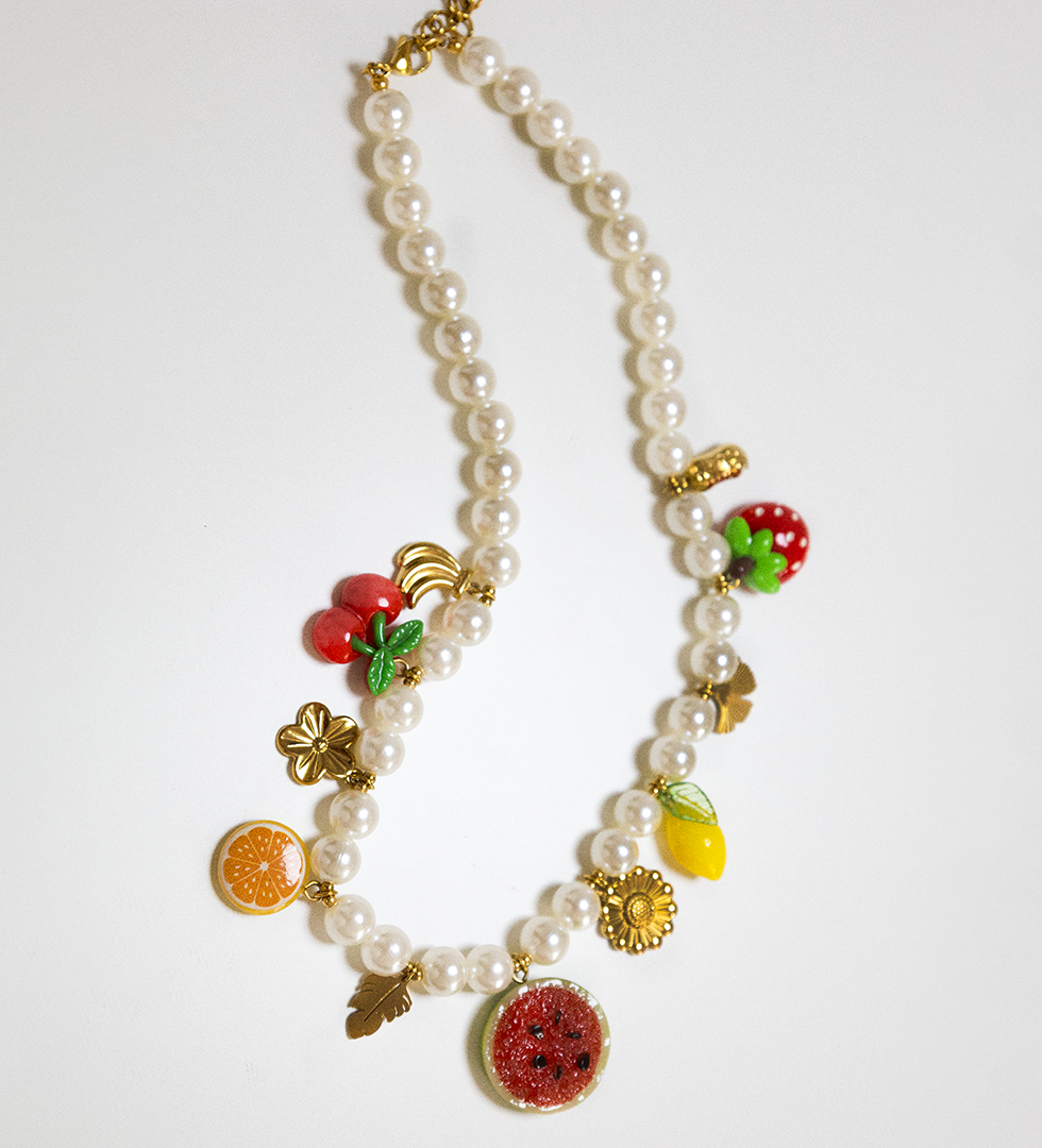 Colar Aço Dourado Perola Pingente de Frutas e Flores