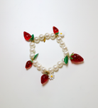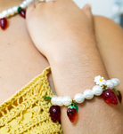Pulseira Aço Dourada Pérolas, Morangos e Flor Branca